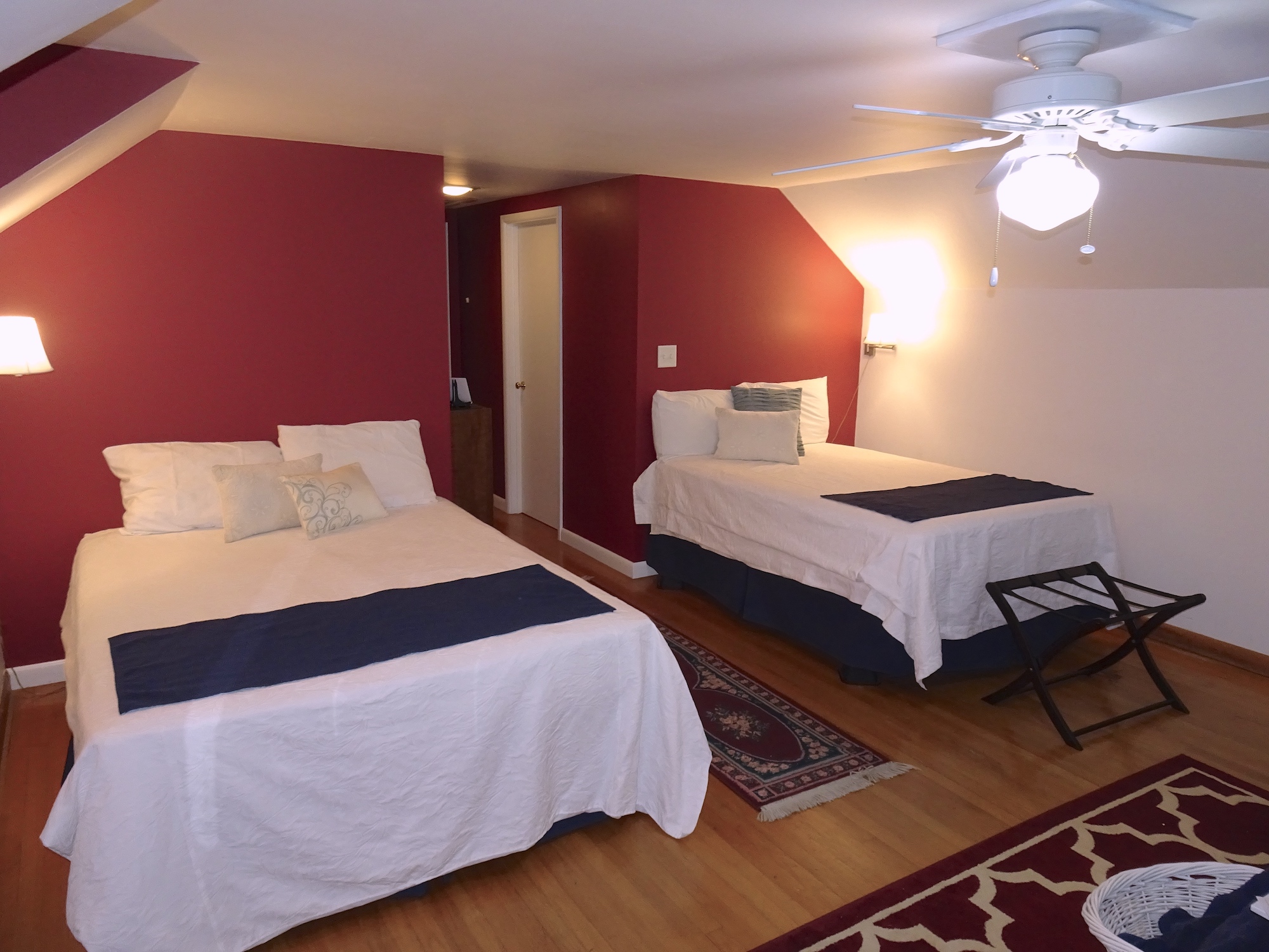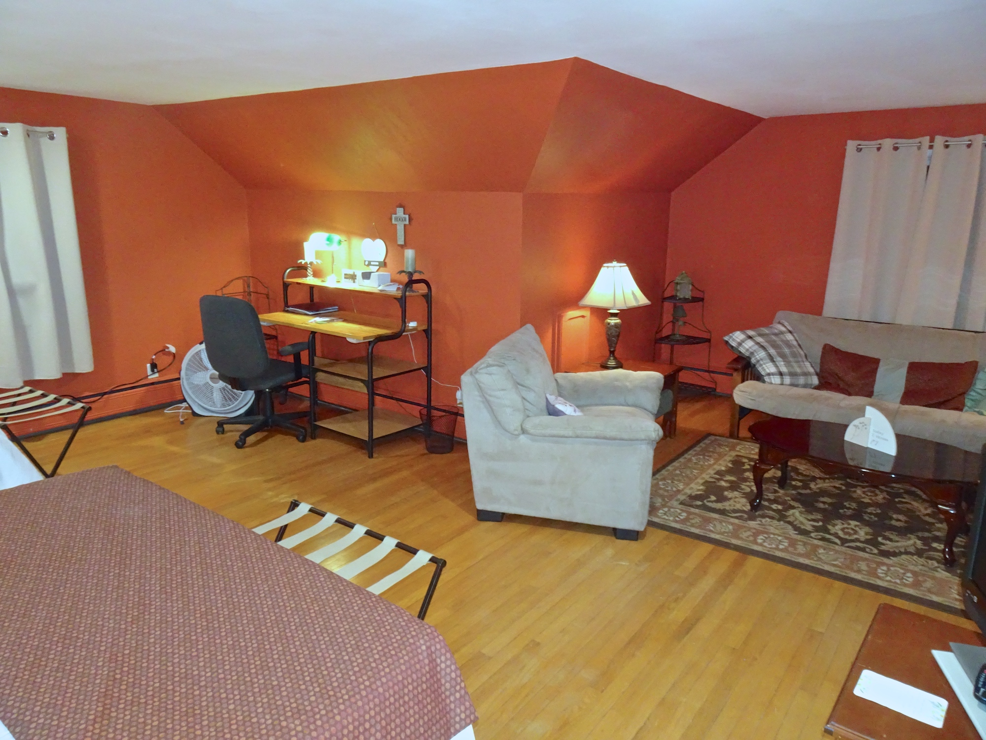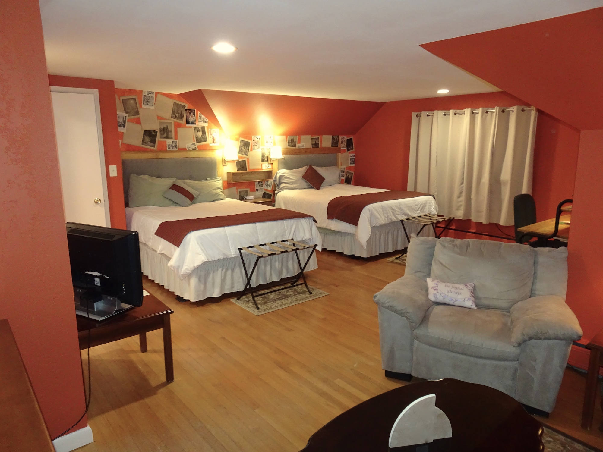 Upstairs are two suite-size rooms with one queen bed and one full each, one has a futon and one has a daybed with a trundle. Each room has a sitting area and desk for study. Each suite has a bathroom. Main level are three bedrooms with one queen bed each and a full bedroom. There are sitting areas in each bedroom. Bath is located in the hall and a 1/2 bath on the same floor by the laundry room. Breakfast and dinner are served. Ministry is available, if desired, or quiet time for a sabbatical. The Multi purpose room in the lower level can be set up as a small conference room, a prayer room or with workout equipment. There is also a game room with darts, air hockey, pool table, ping pong, children's toys and many games and puzzles.