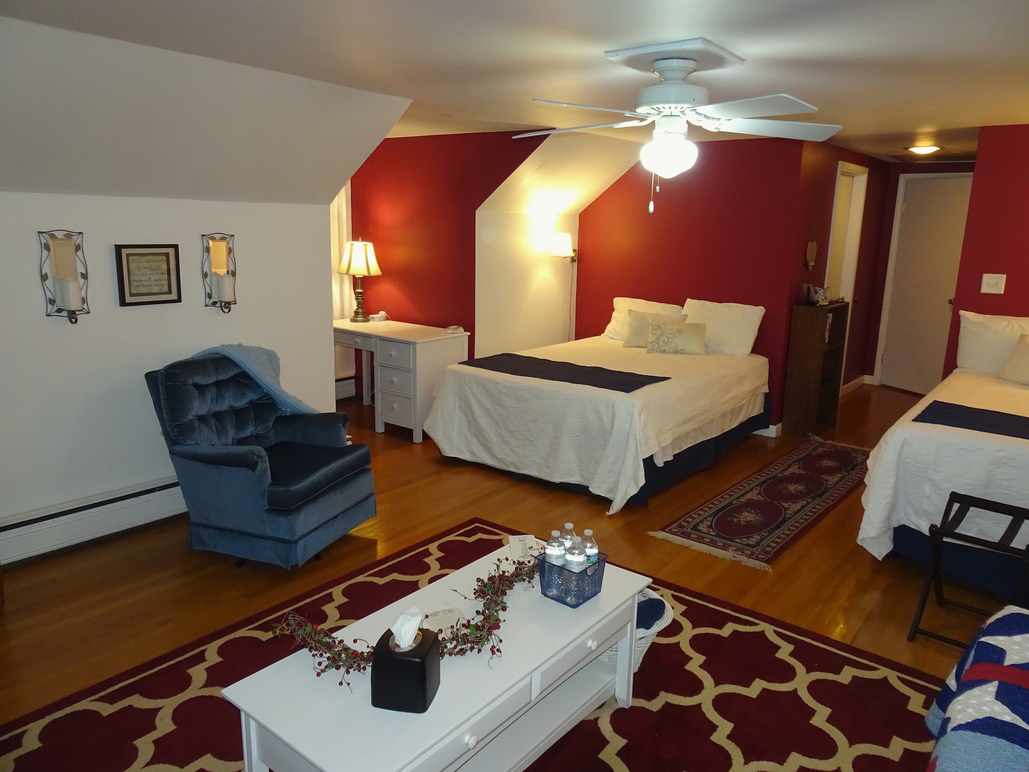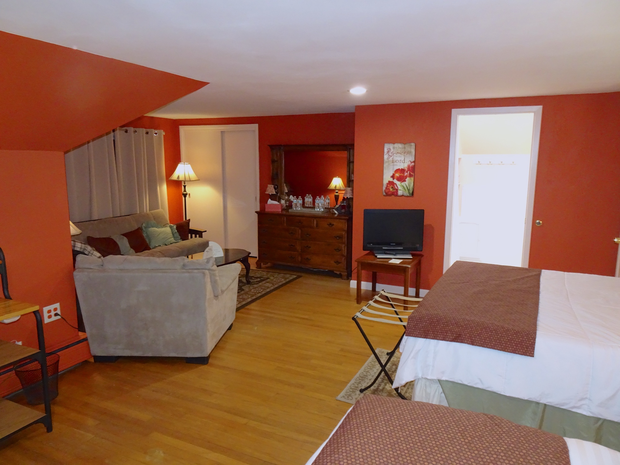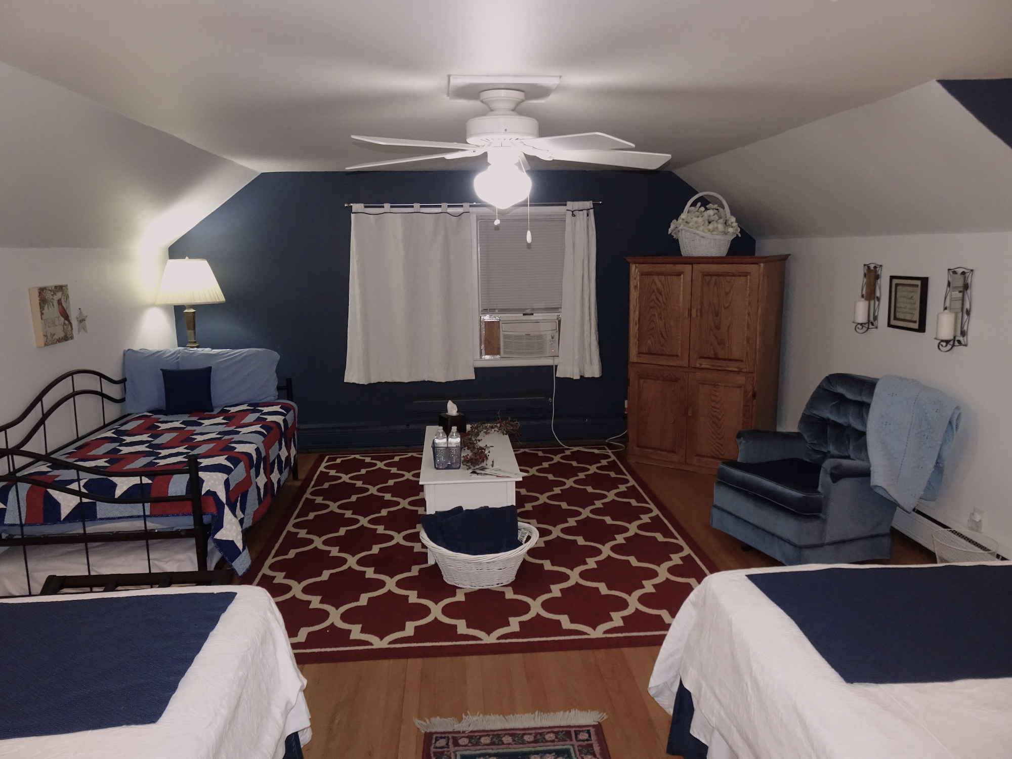 Upstairs are two suite-size rooms with one queen bed and one full each, one has a futon and one has a daybed with a trundle. Each room has a sitting area and desk for study. Each suite has a bathroom. Main level are three bedrooms with one queen bed each and a full bedroom. There are sitting areas in each bedroom. Bath is located in the hall and a 1/2 bath on the same floor by the laundry room. Breakfast and dinner are served. Ministry is available, if desired, or quiet time for a sabbatical. The Multi purpose room in the lower level can be set up as a small conference room, a prayer room or with workout equipment. There is also a game room with darts, air hockey, pool table, ping pong, children's toys and many games and puzzles.