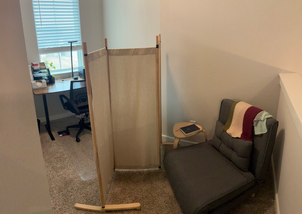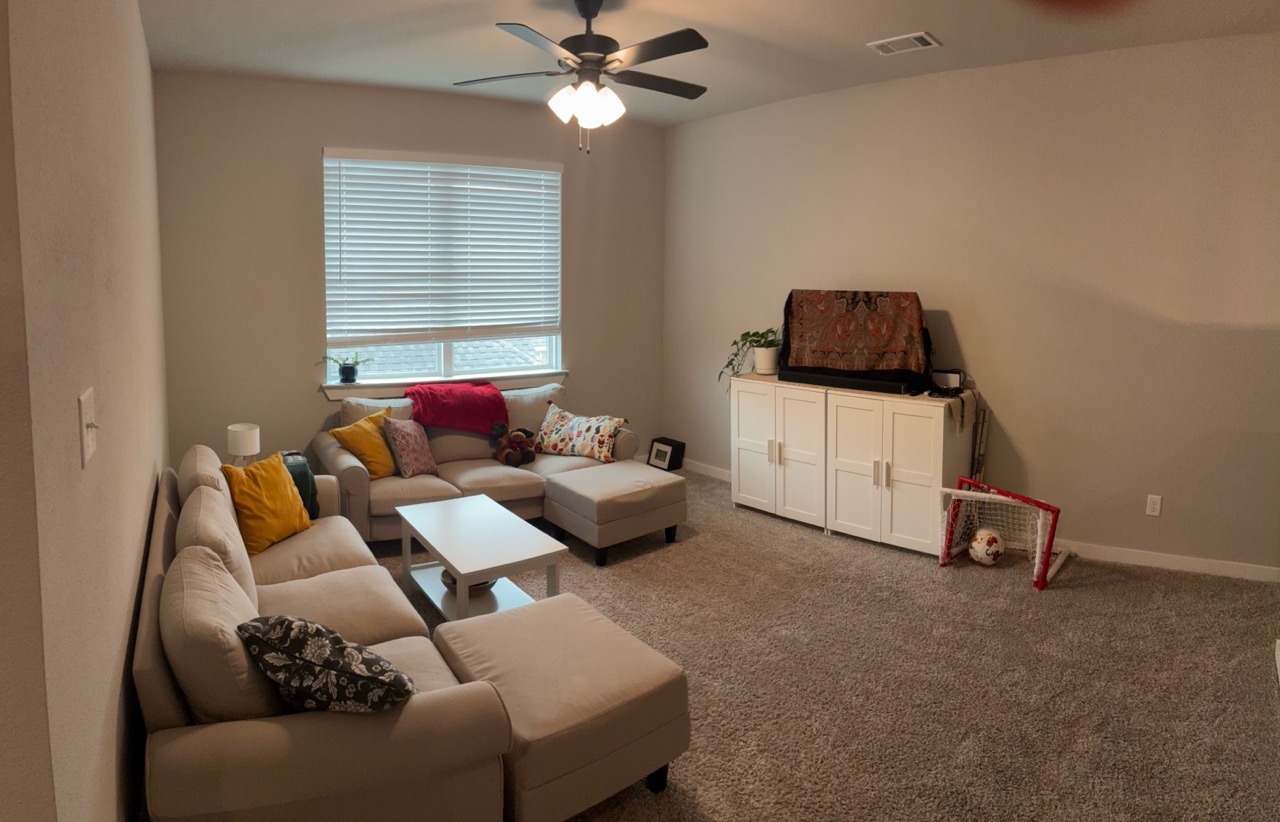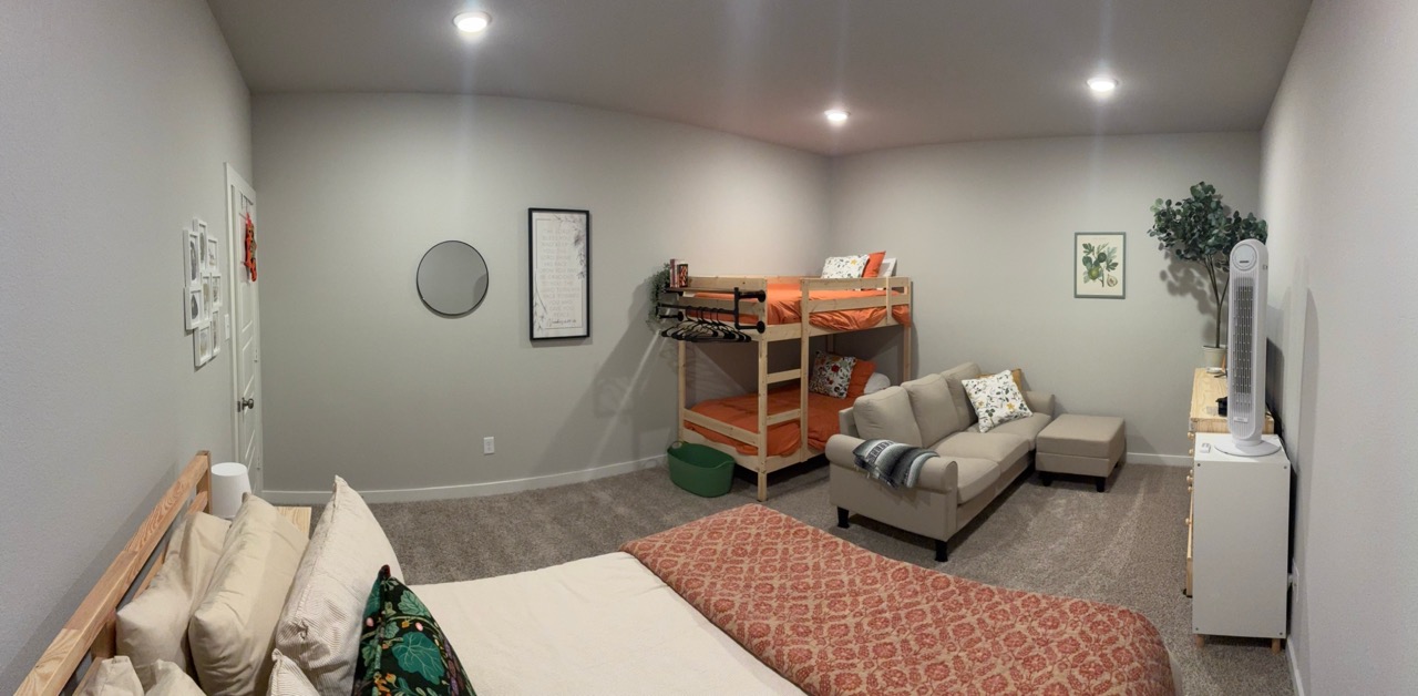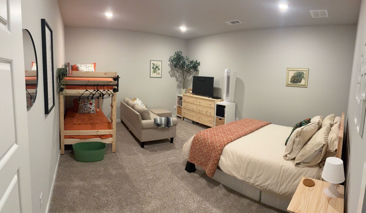 This home has a large upstairs guest room set aside for hosting. The room has a queen bed and twin bunk bed, along with a couch and TV. The bathroom is in the hallway, and shared with the hosts teenage children. There is also a downstairs office that has been converted into a bedroom which can be available when their oldest is away at university. The home is in a kid-friendly neighborhood with lots of walking paths. Guests can have access to the kitchen, washer/dryer, and WiFi. Guests bring own groceries/make own meals.
